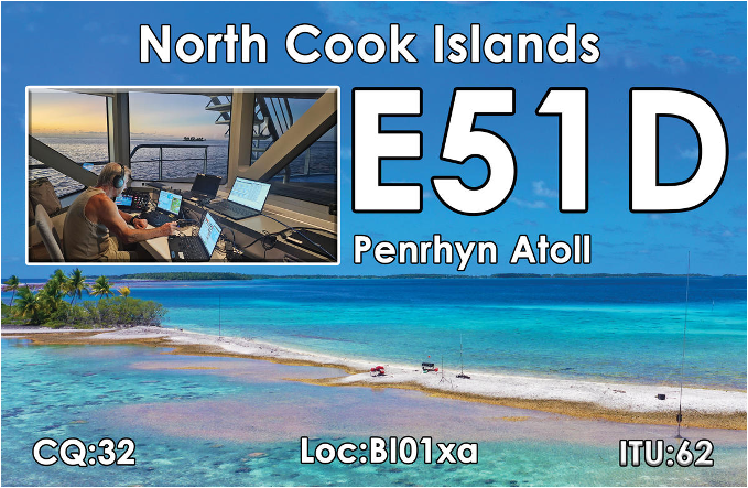 Reactivamos E51D el 23 de septiembre de 2024. Estuvimos en el aire durante unos días desde el atolón Suwarrow como E51D/MM (no válido para DXCC) y luego, a partir del 28 de septiembre, como E51D desde un pequeño cayo (motu) dentro del atolón Penhryn. Se trata de una operación corta, principalmente de banda baja, para probar algunas antenas nuevas. Estaremos listos para operar el 5 de octubre alrededor de las 1600Z.