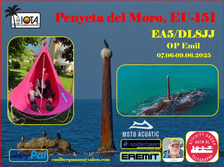 [RECORDATORIO ANTICIPADO] – Emil, DL8JJ se puso en contacto para decir que espera estar activo desde Penyeta del Moro EU-151 como EA5/DL8JJ durante el 7 al 9 de junio de 2025. QRV en 40-10m; SSB y CW (principalmente CW) utilizando un Elecraft KX2, IC-705, Eremit LiFePo4, antena especial Rick Westerman Inv. L, PalmRadio y remos de aventura Dennis Walter Begali y equipo Biwak y de escalada.