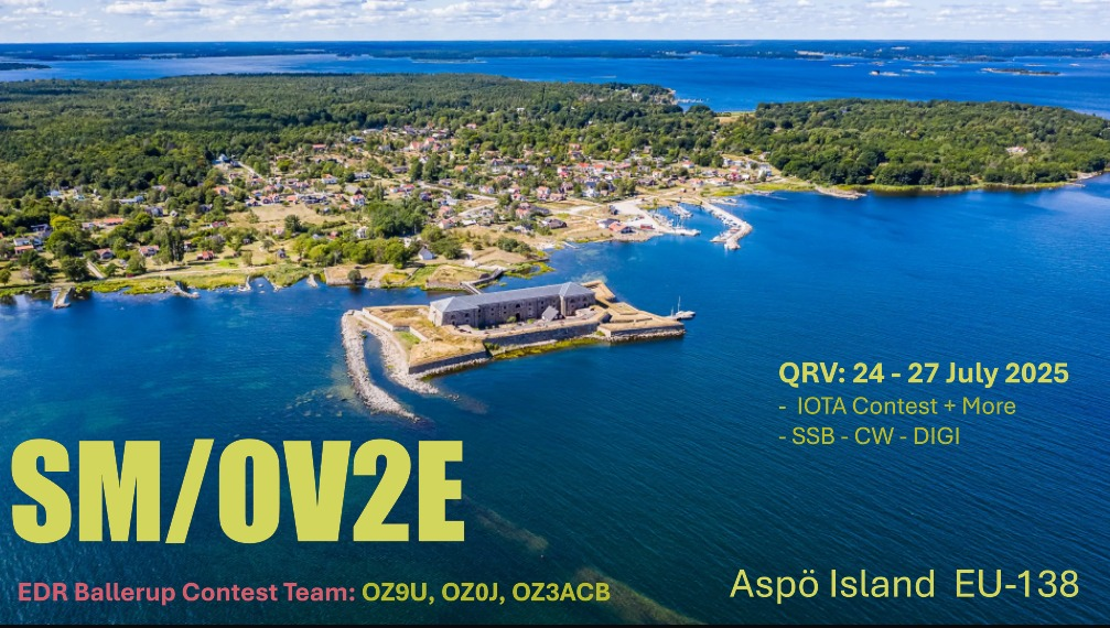 OZ9U, OZ0J and OZ3ACB (EDR Ballerup Contest team) will QRV as SM/OV2E from Aspö, IOTA EU-138 during July 24-28. Activity in SSB, CW, and DIGI before and after the contest. QSL via LoTW and OZ0J.